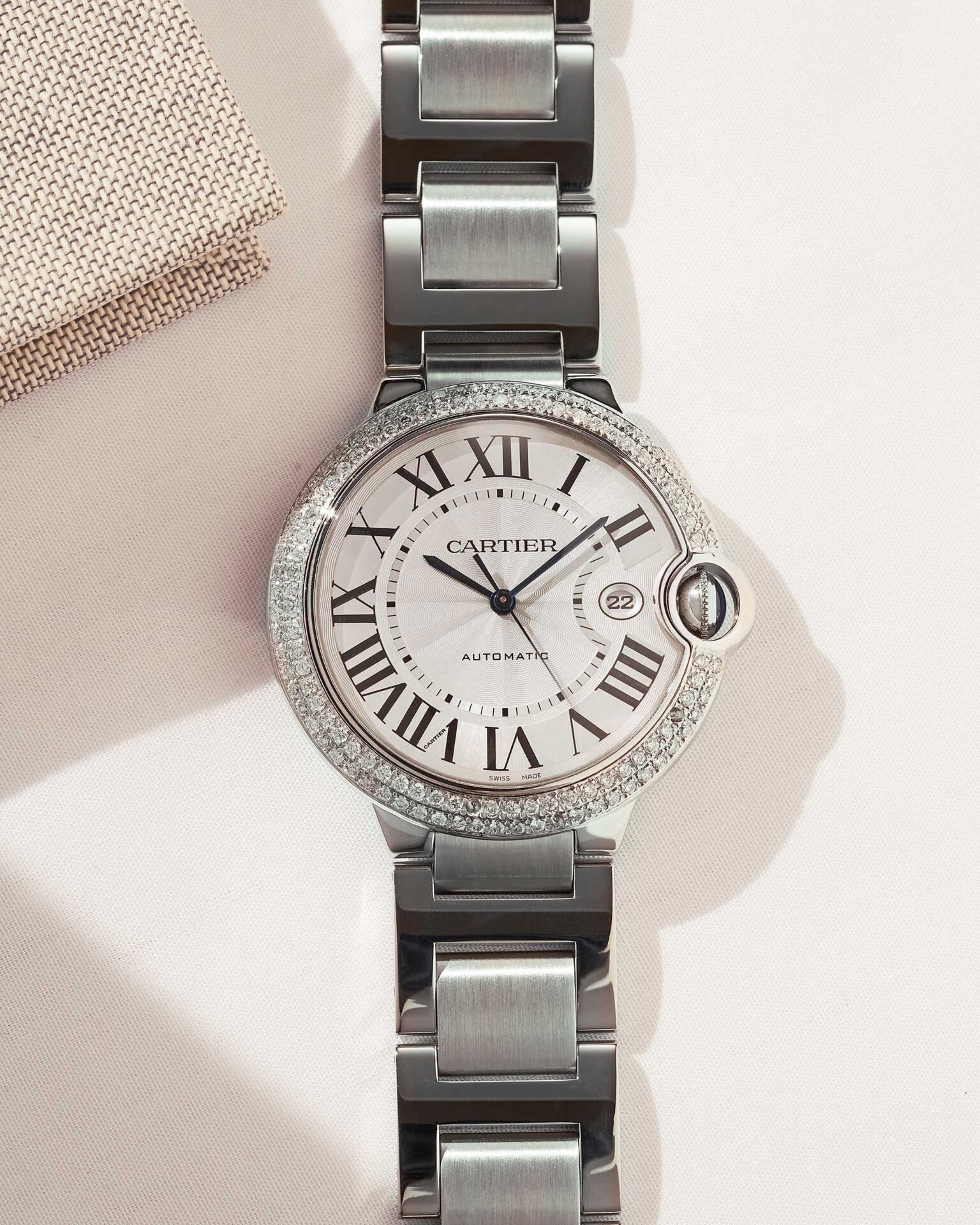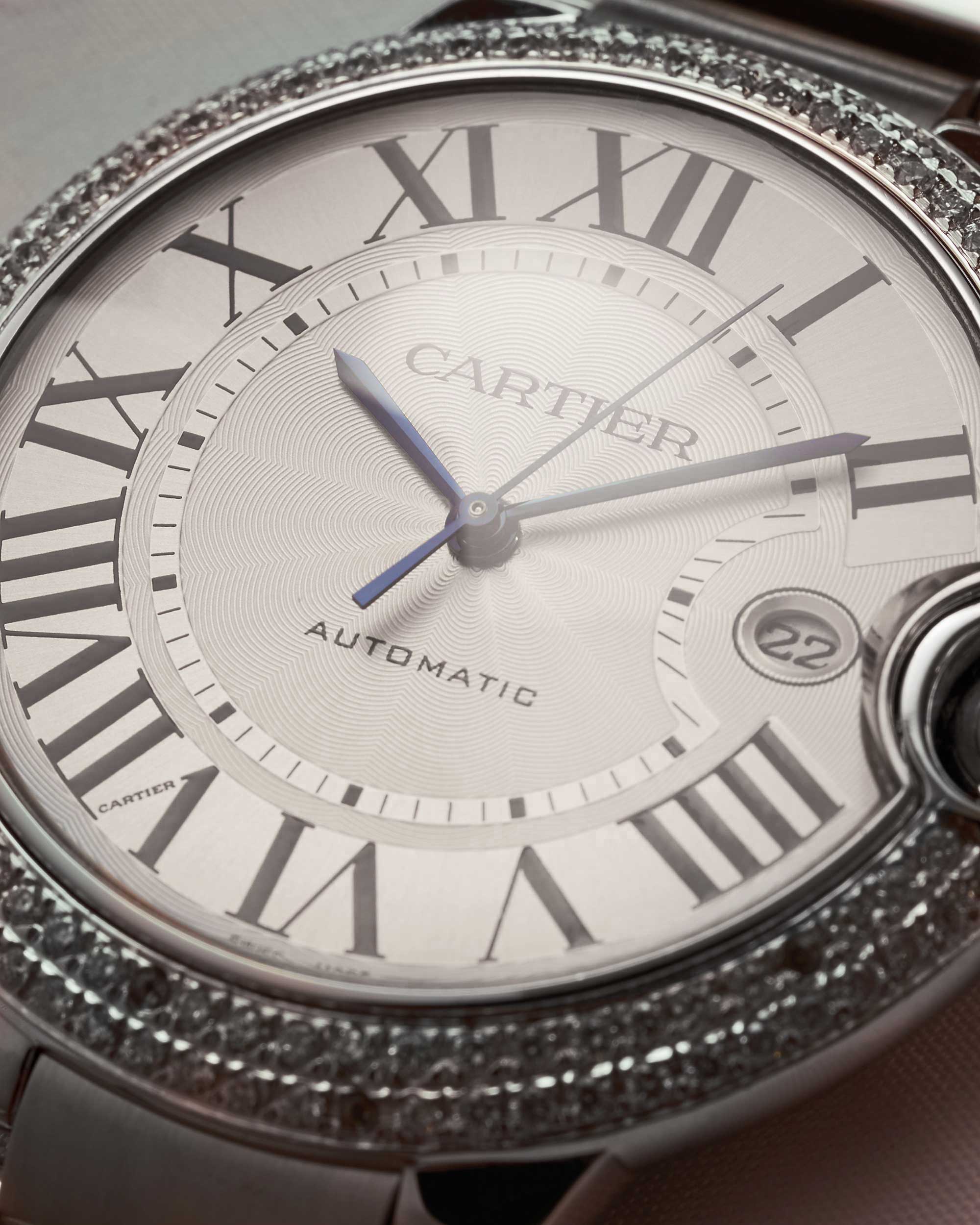Diese Cartier Ballon Bleu wird mit einem Leopold & Co. Zertifikat geliefert. Der After Market Diamantbesatz fügt eine einzigartige und persönliche Note hinzu, die diese Uhr von anderen Modellen abhebt.