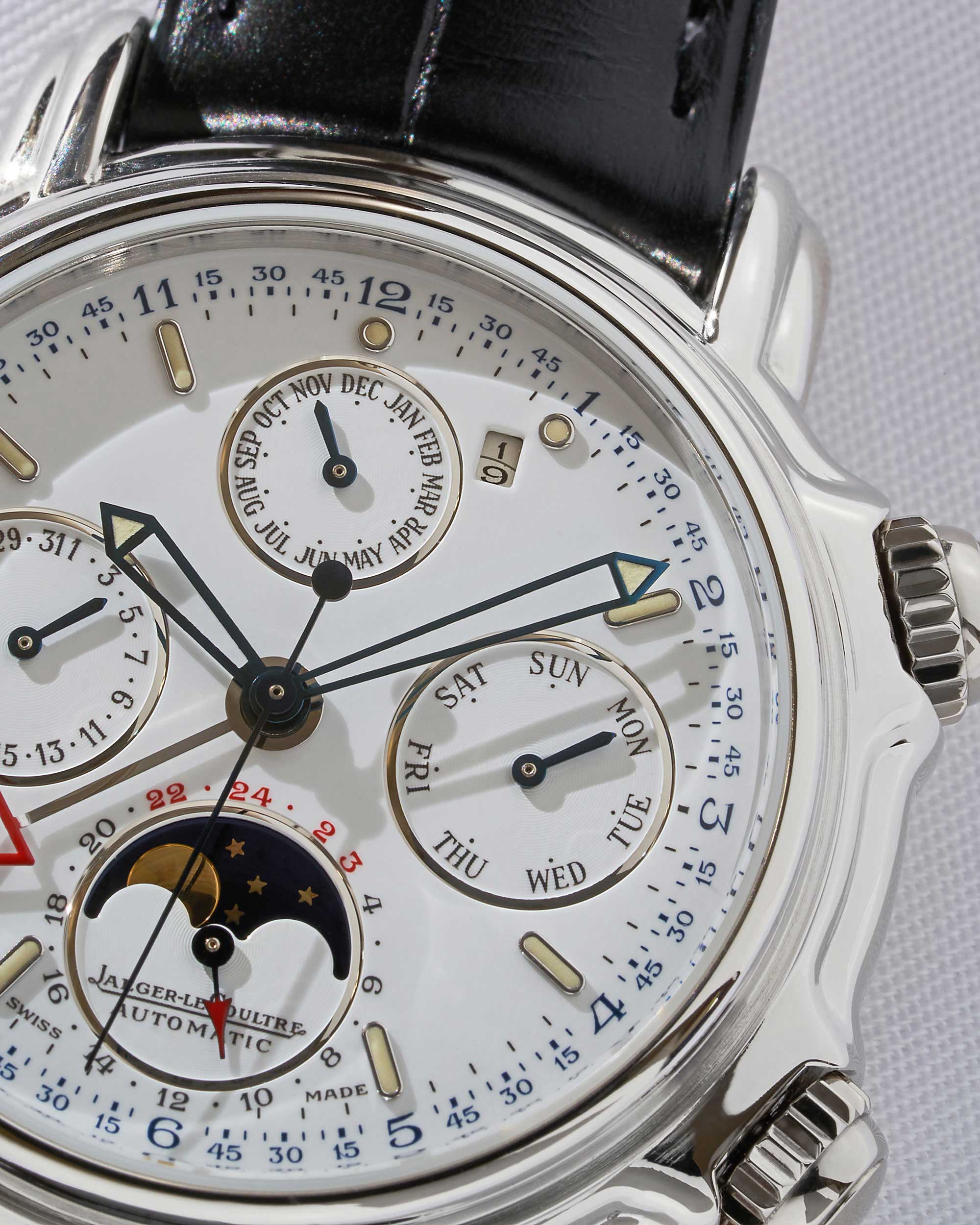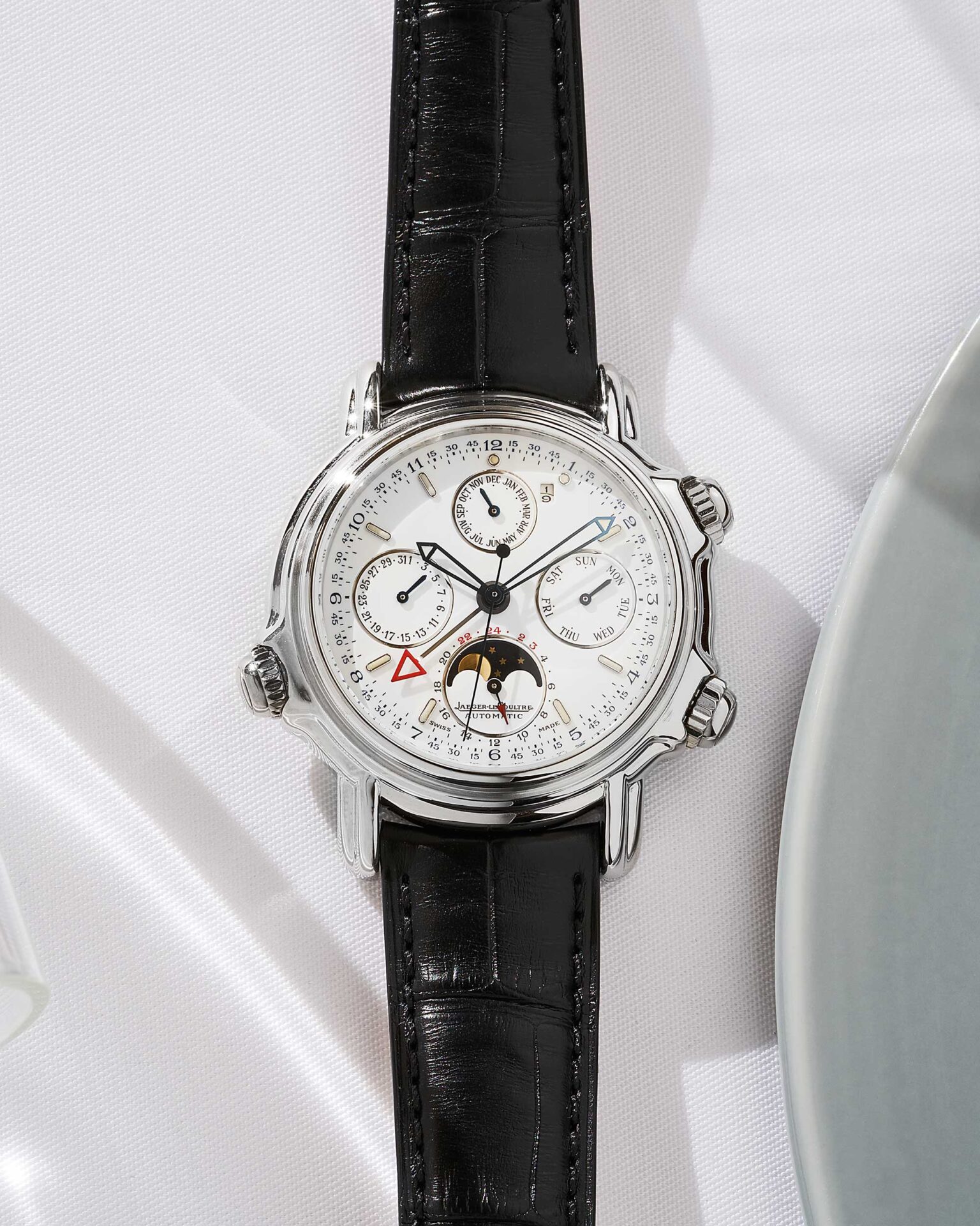 Diese außergewöhnliche Armbanduhr verkörpert die Quintessenz der Haute Horlogerie und ist ein begehrtes Sammlerstück für anspruchsvolle Uhrenliebhaber. Mit einem Durchmesser von 41 mm präsentiert sich das Platingehäuse der Jaeger-LeCoultre Referenz 180.6.99 im großzügigen Format, das den Blick auf das atemberaubende weiße Zifferblatt lenkt. Die klare und elegante Gestaltung des Zifferblatts ermöglicht eine präzise Ablesbarkeit der Uhrzeit sowie der vielfältigen Funktionen des ewigen Kalenders. Das exklusive krokolederne Armband verleiht der Uhr einen Hauch von Raffinesse und Komfort. Es schmiegt sich sanft an das Handgelenk an und unterstreicht den luxuriösen Charakter dieser Jaeger-LeCoultre-Uhr.