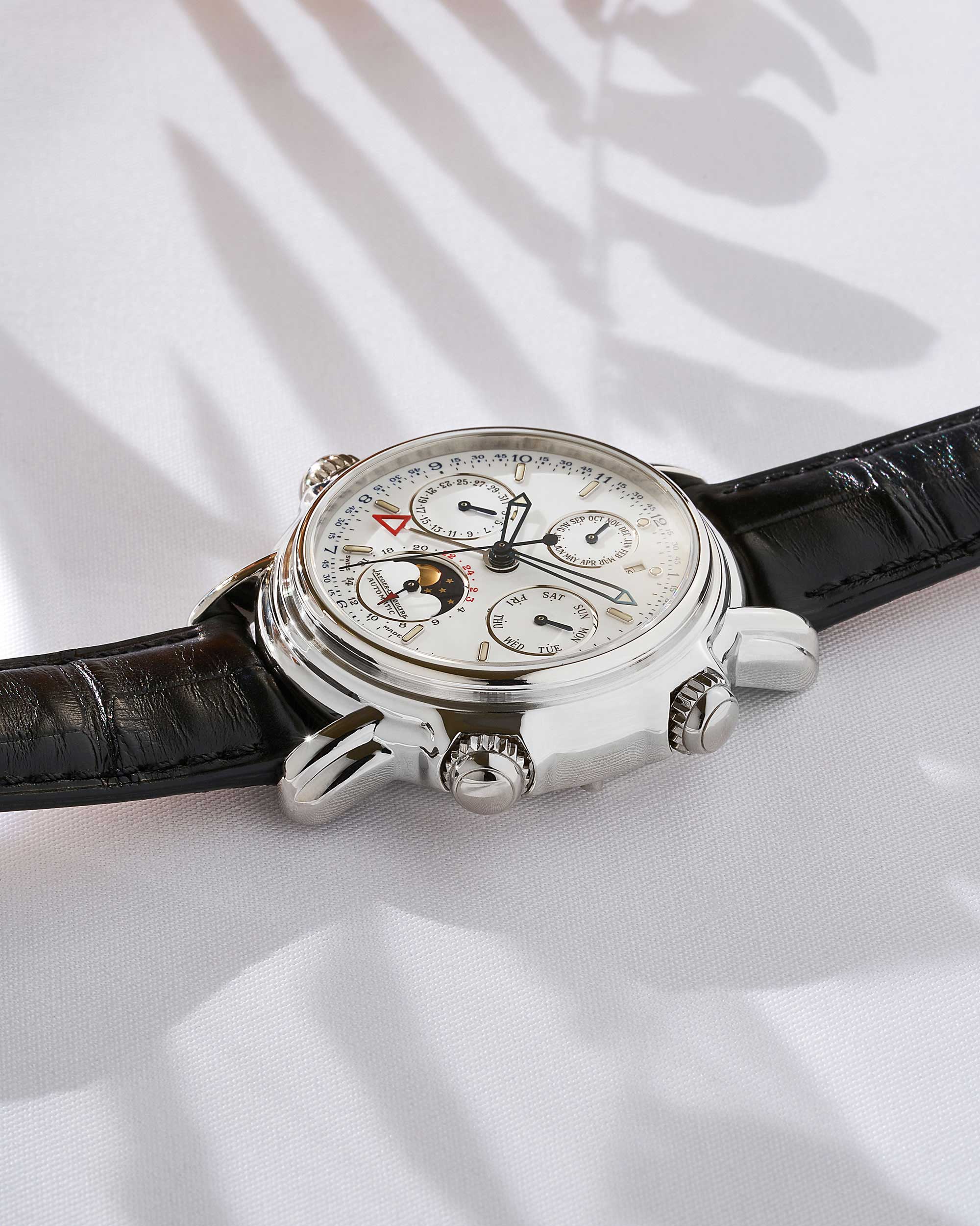 Jaeger-LeCoultre Grand Reveil Perpetual 180.6.99 in Platin, weißes Zifferblatt, Saphirglas und Lederband. Service Papiere aus 2019.