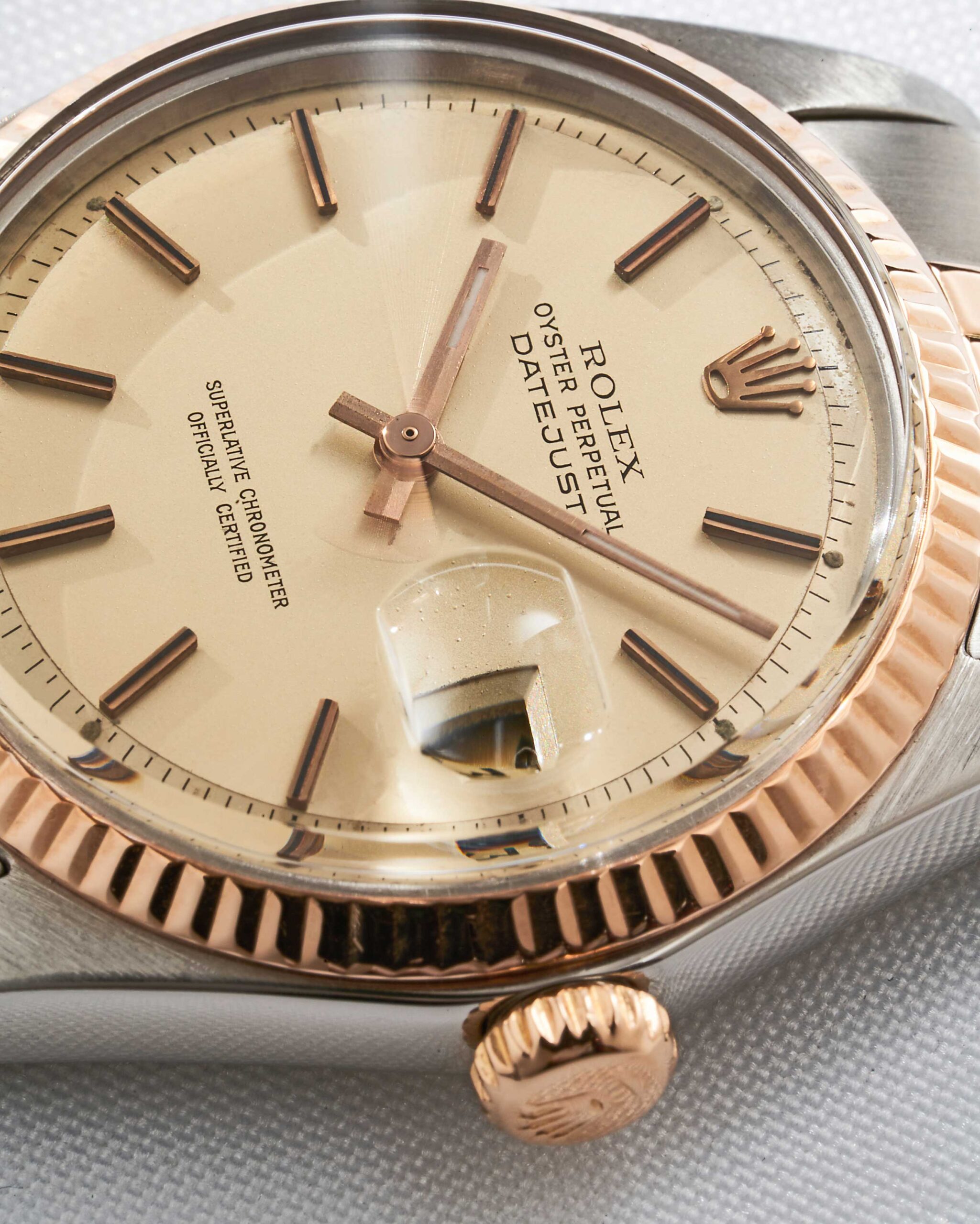 Vintage Rolex Datejust Referenz 1601 in Edelstahl und 14k Roségold, cremefarbenen Zifferblatt, Plexiglas und Jubiléeband. 2,9 Mio. Serie aus 1972.