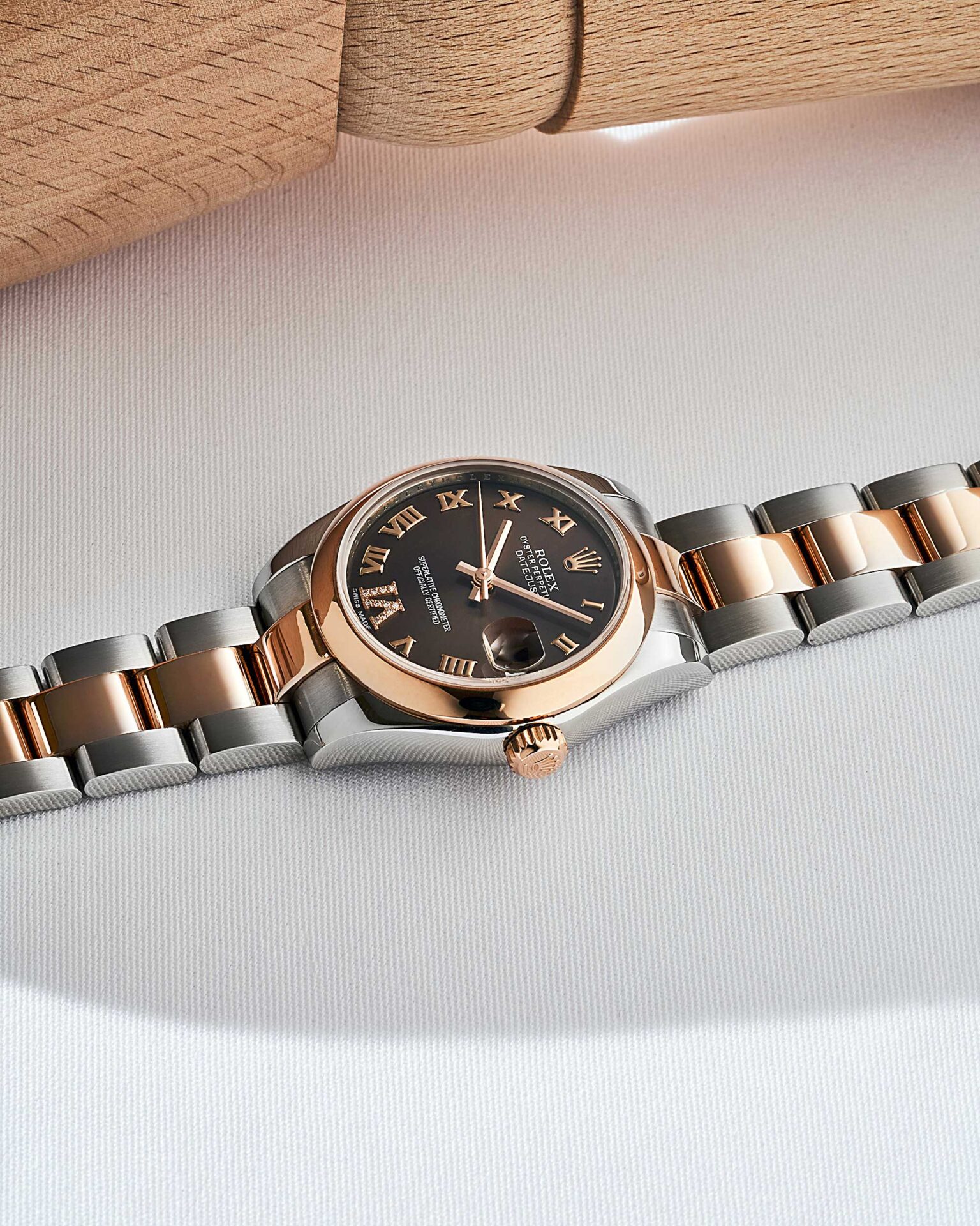 Rolex Datejust Medium in Edelstahl/Roségold mit Oyster-Band, braunes Zifferblatt mit Diamantbesatz auf der 6, Roségold-Lünette, Box & Papiere (LC100) aus 2015