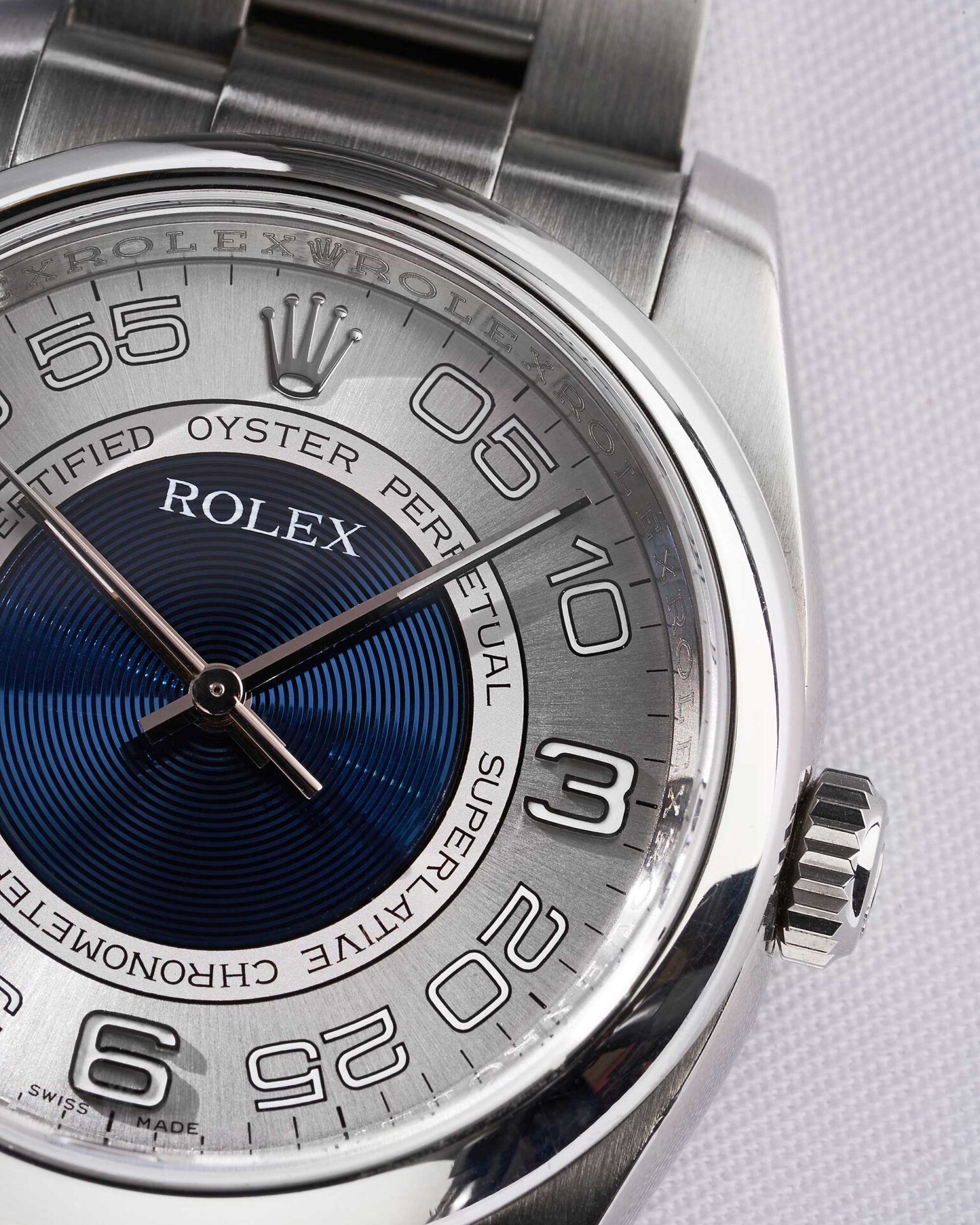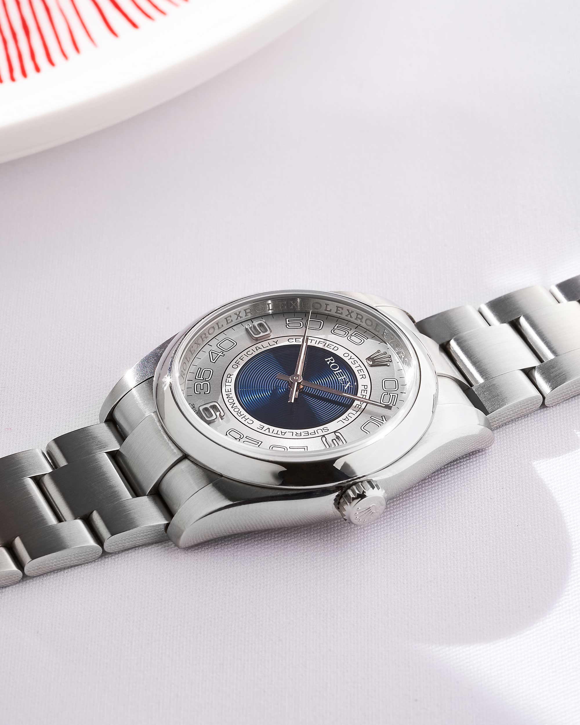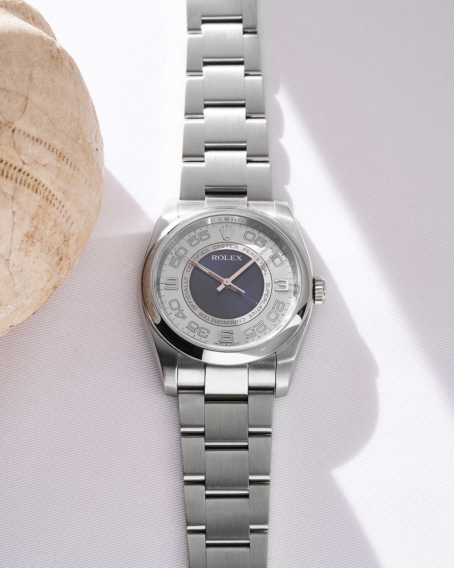 Gefertigt mit dem charakteristischen Oyster-Gehäuse und -Armband aus Oystersteel, ausgestattet mit einem Oysterclasp, gewährleistet die Uhr Langlebigkeit und Raffinesse. Der Verzicht auf eine geriffelte Lünette oder ein Datumsfenster bringt eine erfrischende Ästhetik in die Kollektion und stellt konventionelle Vorstellungen von Rolex-Design in Frage.